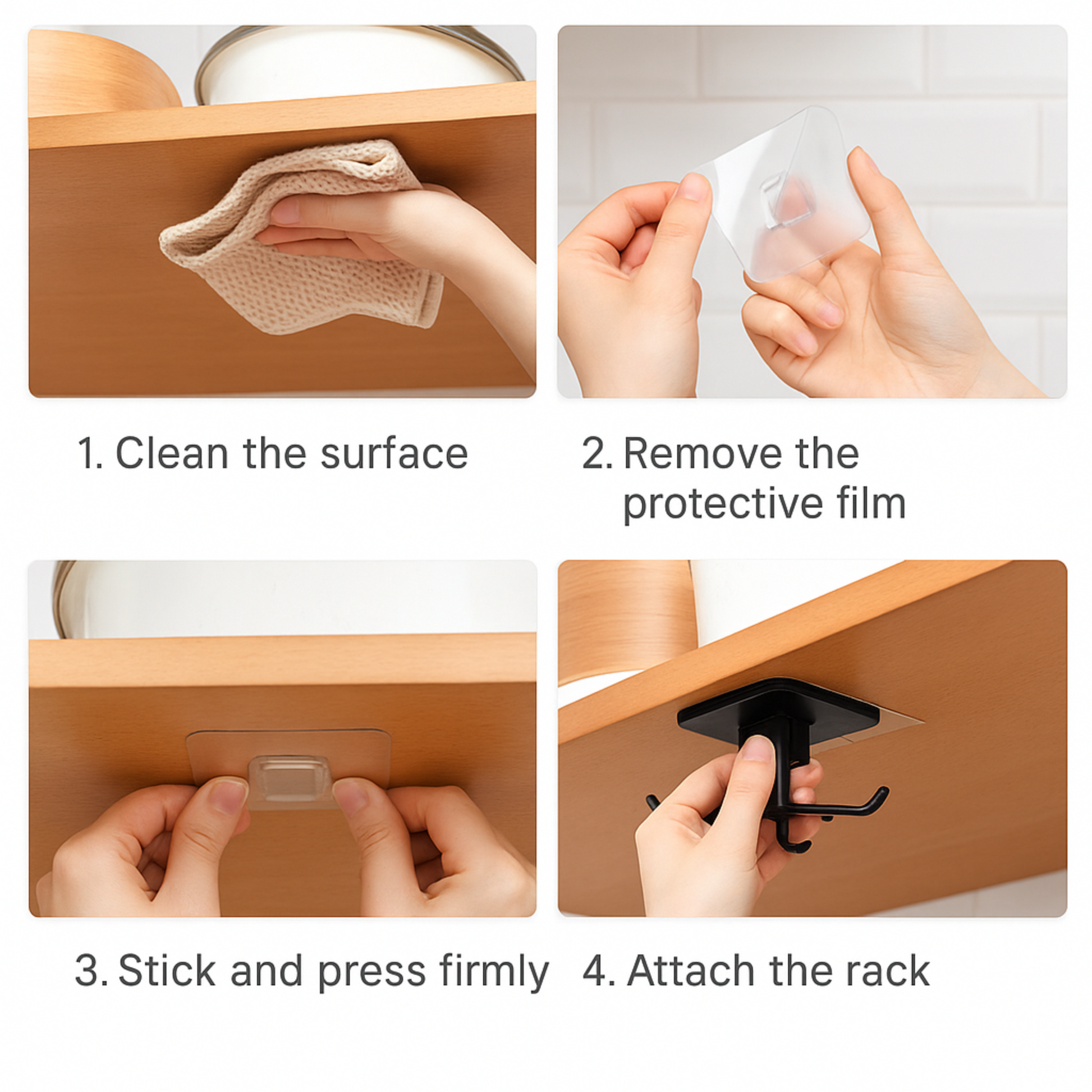 Peel & Stick – Remove the protective film and press the adhesive base firmly onto a smooth, clean surface.